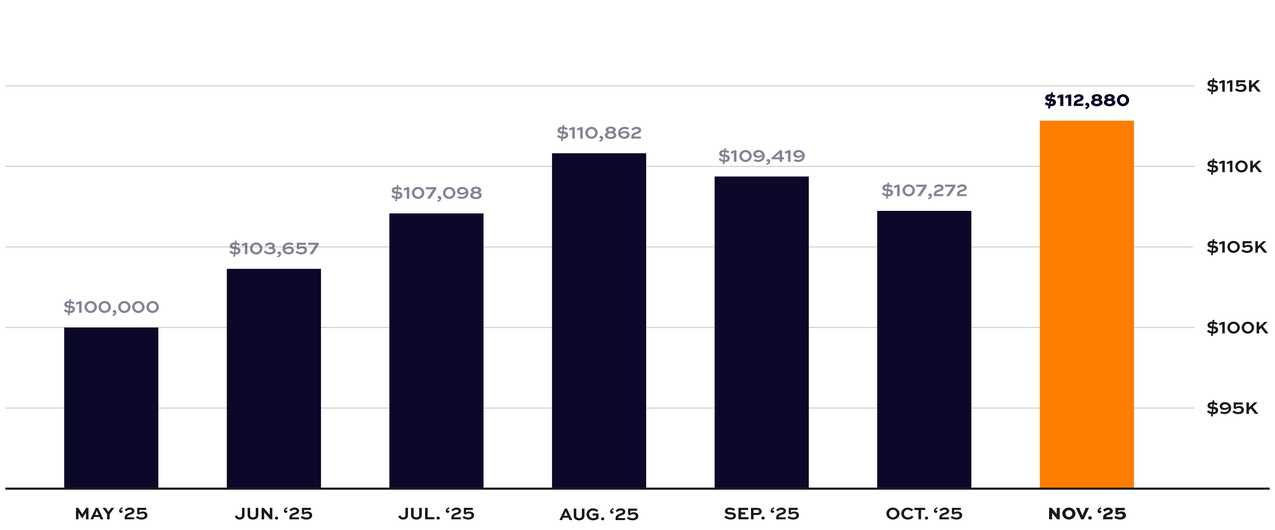 Current price at $25.41 on November 21+$1,428.33 (+128.36%)